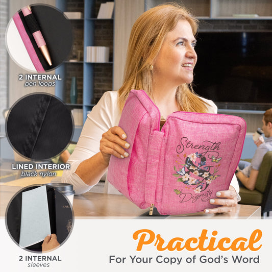 Polyester Canvas Bible Cover for Women W/Zippered Pocket & Pen Storage: Strength & Dignity - Proverbs 31:25 Inspirational Bible Verse Carry Case, Pink Butterfly Floral, Large