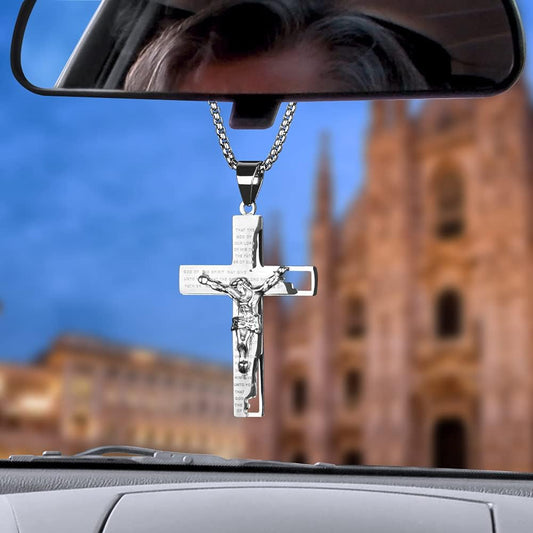 Cross Pendant Charm for Car Rearview Mirror Hanging Accessories Ornament Truck Jesus Crucifix Cross Necklace Stainless Steel Lord'S Prayer Necklace with Bible Verse (Silver)